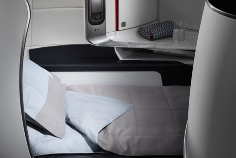 座席のリモコン操作で、数秒で全長2メートルの広々としたフルフラットベッドのシートになります。お好みのポジションに、リモコン操作で簡単に調節することができます。また、どの座席からも通路に直接アクセス可能です。快適性を追求した本格的なフルフラットベッドで、ゆったりとお寛ぎください。