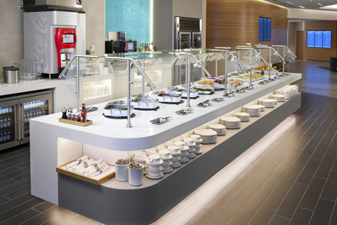 シェフ考案のメニュー、カクテルバー、プレミアムワインテーブルなどを利用し、ご搭乗までお手軽で美味しい食事をご堪能ください。