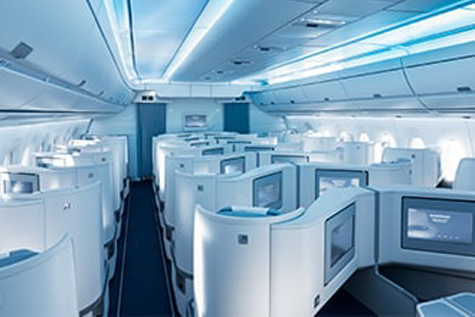 十分にゆとりのあるスペースが確保されたビジネスクラスでは、プライバシーを確保して仕事、食事をお楽しみいただけます。機能性に優れたシンプルなデザインが至福の空の旅を実現。