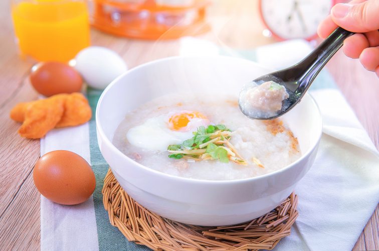 香港の朝食の定番「お粥」。鶏肉や海産物などを中華スープで煮込んでいるので、日本のお粥よりしっかりと味がついているのでとても美味しいです。