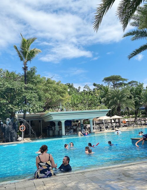 まずは美しく手入れされた庭園を眺めながらの朝食。食事も豪華で大満足でした。この日はマンタと一緒に泳げるツアーでレンボンガン島とペニダ島へ。こちらは事前に日本で「バリ姫」という現地ツアー予約サイトで申し込みました。朝7時半のお迎えで18時までという丸一日のツアーです。20名ほどのツアーで世界各国からのお客さんが入り交じり、欧米の方が多い印象でした。私たちは日本人のガイドも付けたので安心でした(金額は、私たち2人で約3万円ほどでした)。