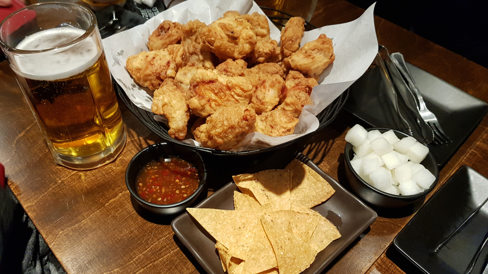 醤油味のチキンに唐辛子や香味野菜がトッピングされた「マッチョキング」(17000w≒1700円)やガーリックたっぷりの「チレカチキン」(17000w≒1700などたくさんのメニューがあります。中でも人気のチキンはチーズやニンニクパウダーがふんだんにかかった「プリンクルチキン」(17000w≒1700円)!チーズ味のお菓子のような味でおもたくないのでぱくぱく食べられます。
