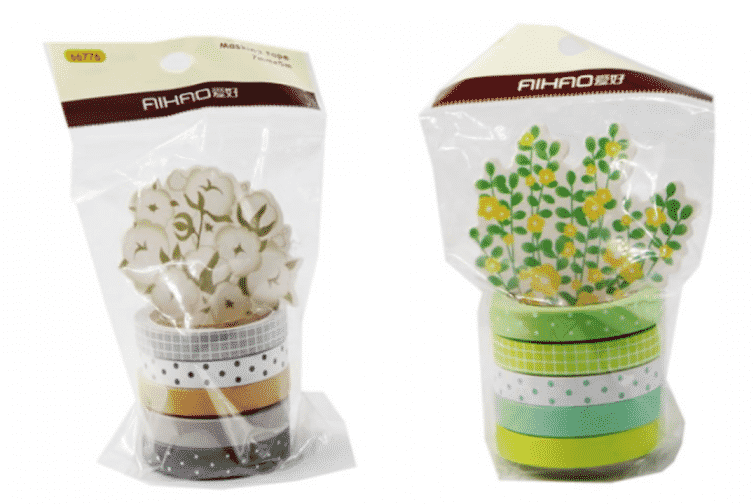 よくパッケージを見ると、マスキングテープの上に植物が描かれてあり、遊び心のあるパッケージも可愛らしい。テープは通常よりも少し細めで5つのパターンがセットになっています。ノートのさし色に、ちょっとしたメモ用にお使いください。