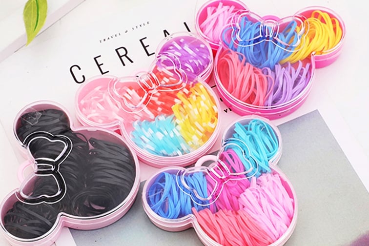 小さい女の子がいるお友達の方にプレゼントしたいヘアゴムセットです。ミニーちゃんの形をした容器が可愛くて、ゴムを別の袋に移してちょっとした小物入れにするのもあり。