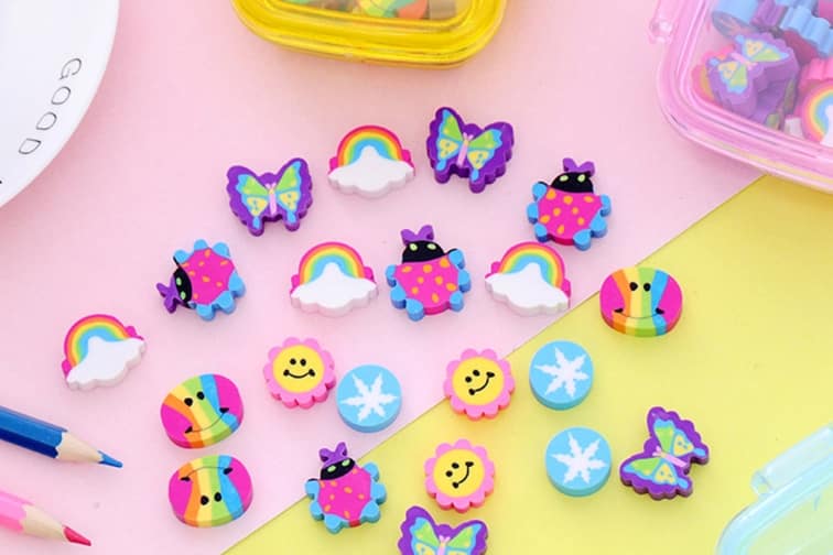 カラフルでお子様に喜ばれるミニ消しゴム。消しゴム以外にも、写真立てやノートにシールとして貼ってみるのも可愛いですね。1つのセットにテントウムシ、レインボー、蝶、雪の結晶、スマイル、花の6種類の消しゴムが入っています。