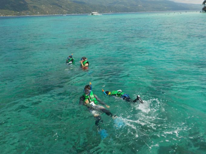 ジンベイザメツアーにも参加しました!早朝にホテルを出発し、片道4時間かけて「オスロブ」へ。ボートで5分ほどしたところでシュノーケリングとライフジャケットを借りて海に潜りました。子供たちはシュノーケリング経験がありませんでしたが、前日ホテルのビーチで1時間ほどシュノーケリングの練習をし、すぐに習得していました。中学生の子供は少し水を怖がっていましたが、3mほどの大きなジンベイザメが真横を泳ぐと大感激していました。