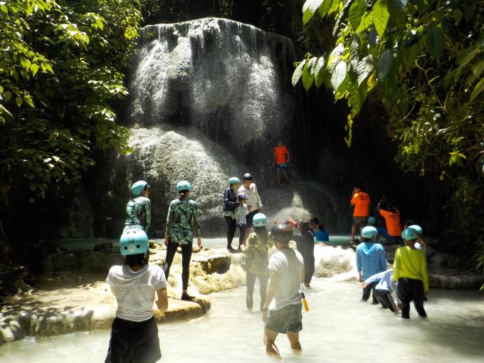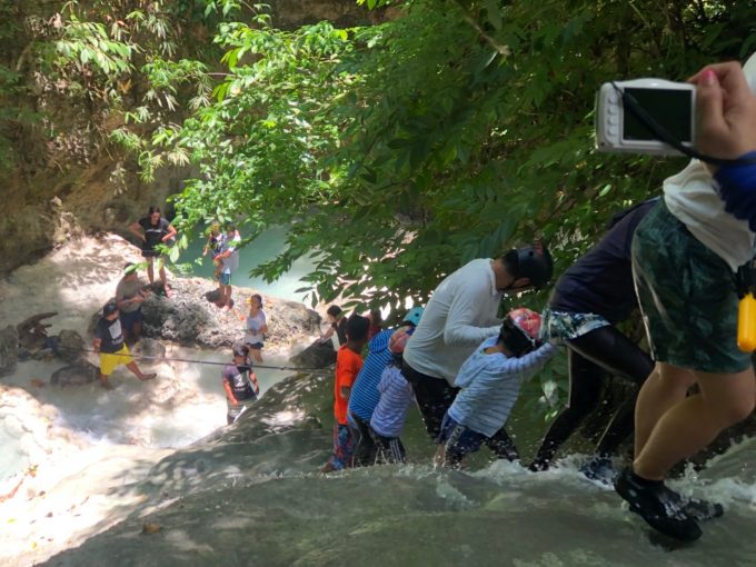 ジンベイザメと泳いだあとは、「スミロン島」へ。通常「ジンベイザメとスミロン島」のみ体験される方が多いと思いますが、私たちはこの後「アギニットの滝」にも行きました。当初母はツアーに参加せずにホテルで待っている予定でしたが、急遽一緒に参加することになったんです。ツアーの応募要項には「老若男女問わず楽しめる」とありましたが、さすがに「アギニットの滝」は母にはきついかなと予想していたんです。危うく滑ってしまうような箇所が3か所ほどあるんですけど、安全のために無料でヘルメットと滑り止めのマリンシューズを貸し出ししてくれますし、スタッフさんが優しくサポートをしてくれたおかげで、母含めて全員滝の頂上まで登ることができました!だいたい片道20分ほどですが、ジンベイザメと泳いで、スミロン島にも行き、しかも長時間の車移動のあとでしたので、想像以上にきつかったです(笑)。