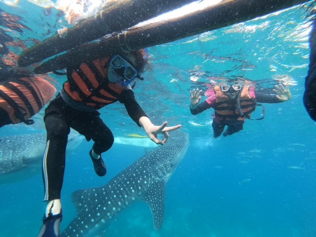 ホテル周辺は雨だったのでお天気が心配でしたが、オスロブは快晴!よかったです。すぐにボートに乗ってビーチから20~30mくらい離れたところで海の中へ。 ジンベエザメには触れないでください、とのアナウンスが事前にありましたが、すごく距離が近く向こうから当たってくる感じでした!ツアー中はたくさん写真も撮ってくれてすごくよかったです。