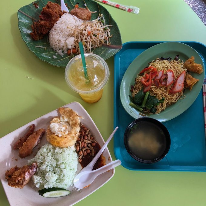 それから屋台村のホーカーズにも行きました。そこでは3人それぞれ気に入ったものを買ってみました。見た目で決めたので、何を買ったのかよくわからなかったせいか、アタリもあればハズレもあったんですが、どちらにしても現地の食事を食べることができたので、それには満足しました。僕が買ったのは、定食っぽいものです。朝のモーニングセットみたいな、お米と鶏肉が乗ったプレートのようなものでした。それからフルーツジュースもたくさんありました。おいしかったので、シンガポール滞在中、よく飲みましたね。