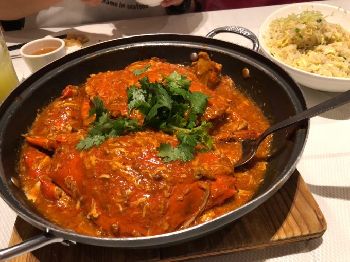シンガポールでの食事ですが、チリクラブが有名だということで、それを食べに行きました。行ったのはチェーン店でジャンボ・シーフードというレストランというところです。本当はリバーサイド店が景色もよくて人気だと聞いていたので、そこに行ってみたかったんですけれども、予約が必要なくらいに混んでいて、仕方ないので系列のお店に行きました。とはいえチリクラブはすごくおいしかったです!