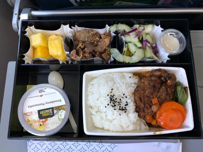 機内食は2つの中から選べるようになっていて、味はおいしかったです。日本からマニラまでは、日本食か欧米食かを選ぶのですが、どちらもフィリピン色の強い内容ではありませんでした。マニラからは現地食で、チキンかビーフか選ぶという感じで、味付けは僕としては大変気に入りました!