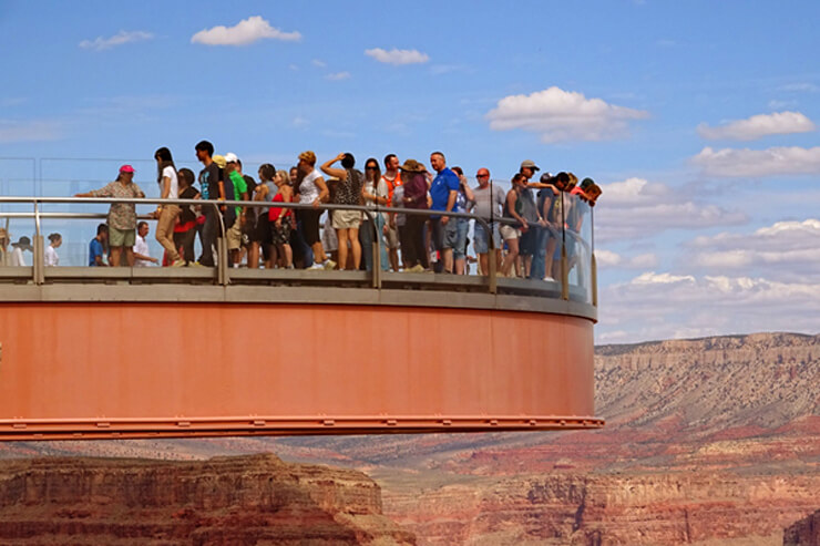 グランド・キャニオンを一望できるビュー・ポイントは複数あります。その中でも、スリル大好きな方におすすめしたい新名所「スカイウォーク」。2007年からスタートした観光アトラクションで、馬の蹄のようなカーブを描き、崖から空中に突き出した橋は、なんと床が強化ガラス製!ガラス越しに約1,200mの真下の谷底を覗き込むことができます。高所恐怖症の方は確実に足がすくんでしまう、スリル満点のスポットです!なかなか味わえない大渓谷の空中散歩、是非体感してみてください!