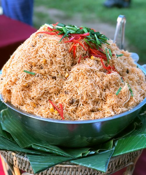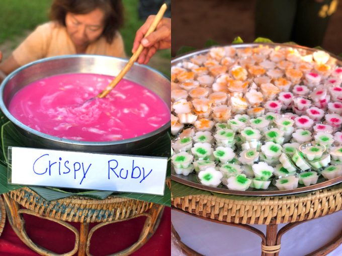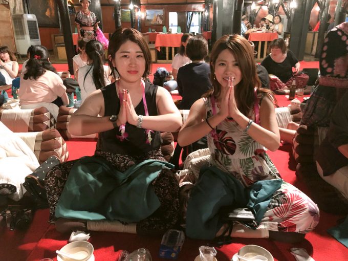 今回のツアー最後の夕食は、タイの由緒正しき雰囲気ただよう場所。あぐらをかいて床に座って食事をいただきます。真ん中がステージになっていて、歌と踊りを楽しみながら本格的なタイ料理を堪能しました。この日は本当に伝統的な食事で、手で食べました。言えばお箸をもらえたと思いますが、私たちはタイに敬意を払って手で食べてみましたよ!
