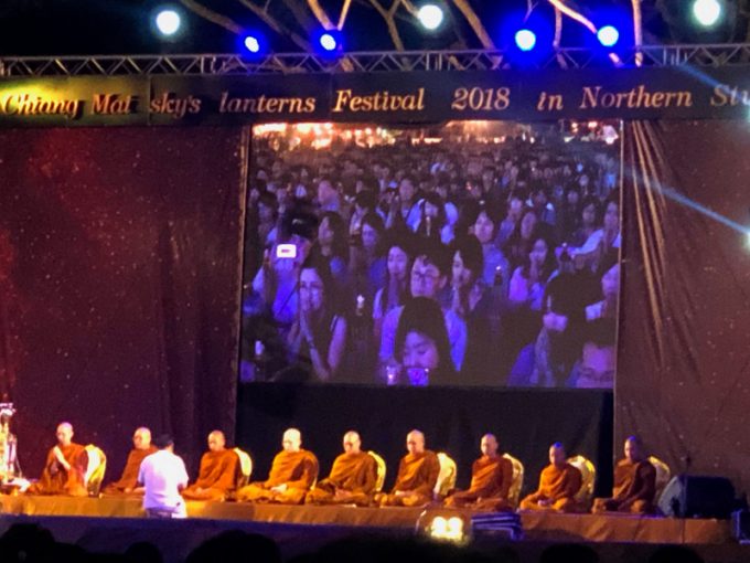 さて、いよいよコムローイ打ち上げ!と思ったら、ステージの上で開会式がはじまりました。現地の方の踊りを見て、僧侶の方のお話を聞いて、そして会場全体でお祈りの時間を過ごします。