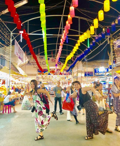 夕食の後は自由行動。チェンマイの中心部は夜もにぎやか!洋服屋、土産屋、マッサージ屋などが、屋台にひしめきあっていました。ツアー中ずっと同じガイドさんが同行してくれるのですが、「屋台では金額を電卓で見せてくるけど、しつこく”ダウン、ダウン”と言っていれば安くなるよ(笑)」などのちょっとしたアドバイスもしてくれる、とっても親切で楽しい方でした!