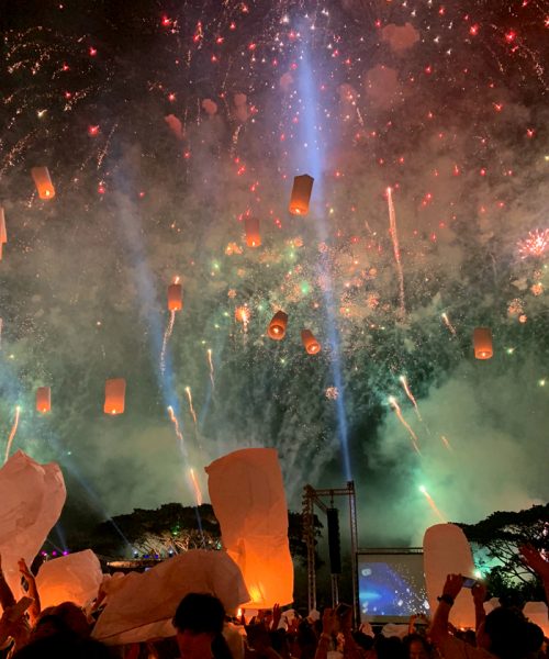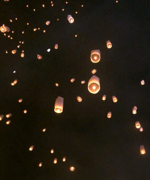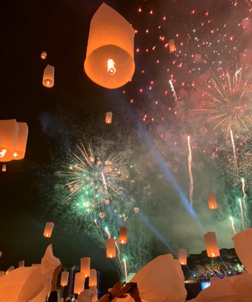 そして、大きなランタンを数千人で一斉に空へ放ちました!!!本当に感動の体験!!信じられないくらいの数の花火も打ち上がって、お祭りムードは最高潮!余っているランタンをまた上げさせてくれるので、私たちはうれしいことに5個も上げることができました!