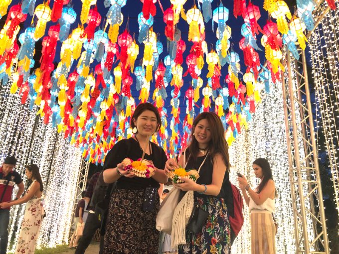 夕方、お待ちかねのコムローイ祭りへ!ホテルから2〜3時間かかった会場には、18時半頃に到着。着いてまず会場の華やかさに驚きました!おめでたいムードが充満していて、お祭りの飾り付けがとにかく手が込んでいて美しい!現地の方にとって大切な行事なのだと改めて感じました。