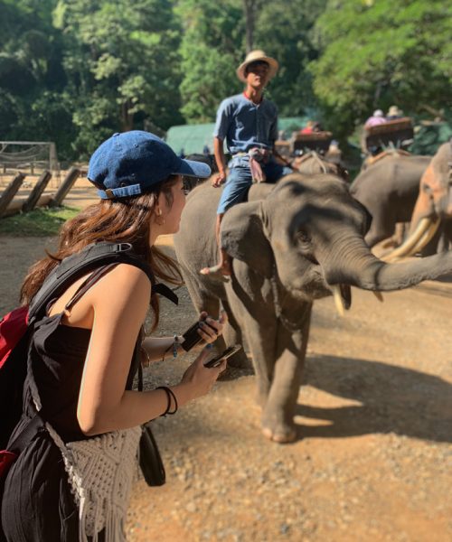 コムローイ祭りは終わりましたが、3日目も楽しい予定がびっしり!午前中は象乗り体験へとでかけました。タイに来たらやっぱり象乗りはやりたいですよね。たくさんの象さんがいてびっくり。象の背中にゆられて迫力満点の象乗りを楽しみました!象が上手に絵を描く様子まで見られて、かわいくて大興奮でした!