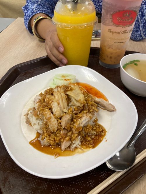 食事の予算を抑えたいと考えていた私たちは、事前に調べていた1Fにある「マジックフードコート」へ。そこでは、10店舗ほどの中から、カオマンガイや揚げ春巻き、マンゴースムージーなどのローカルな名物を手頃な価格で楽しめます。400円ほど支払うとSuicaのようなカードに引き換えられ、フードコート内での飲食がこのカード1枚で可能だったので、とても便利でした。安くて美味しいのでオススメです!