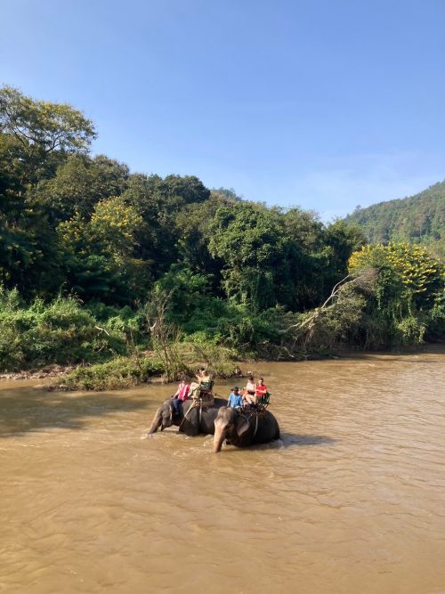 この日の出発は8時から。早起きして、ホテルの朝食をいただきました。朝食はビュッフェ形式で、洋食やご飯、タイ料理が並び、バラエティに富んだ品揃え。まず向かった「メーテン・エレファントキャンプ」では、到着後すぐに象に乗ることができました。象使いのお兄さんと私たちの3人で一匹の象の背に乗って、川の中まで入ります。丘にあがってからも写真を撮ってくれたりと30分ほど乗らせていただきました。私たちの象さんは機嫌が良いのか、鼻から水をシャワーのように吹き出したり、歩幅も大きくなったりして、スリルも味わえて楽しかったです。