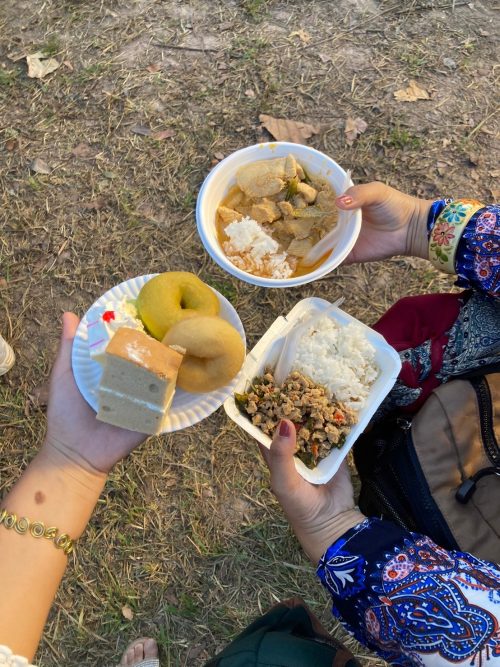 そして、いよいよ今回のツアーのメインイベントであるコムローイ祭りの会場へと向かいます。今年はコロナ後の本格的な解禁ということで、会場は人で溢れ返っていました。以前から聞いていた通り、異国というのに、見渡す限りほぼ全員が日本人でした(笑)。会場に到着すると、すぐに可愛らしい小さな灯籠を川に流すイベントが行われました。午後7時の集合までの間過ごす広場には多くの屋台が立ち並び、食事や飲み物は食べ放題!ただ、トイレがかなり混雑していたので、食事や飲み物は慎重に選ぶようにしました。食事の会場でも、伝統舞踊が披露されたりと、お祭りの前段階からボルテージを上げる企画もたっぷり。