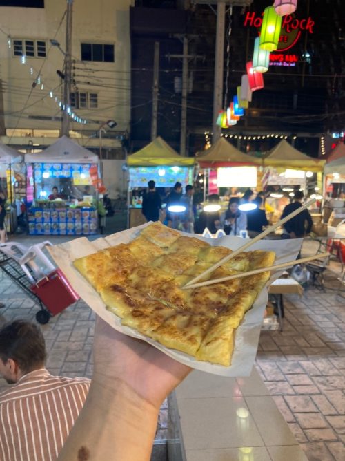 コムローイ祭りが終わり、心に幸せな余韻を残したまま帰路につく途中、ガイドさんから「もしご都合がよろしければ、このままナイトバザールに行くのもいいですよ」とアドバイスをいただき、1日目と同様にナイトバザールへと向かうことに。この日は、ロティと呼ばれるタイ版のクレープ(バナナエッグ味)が特に美味しかったです!