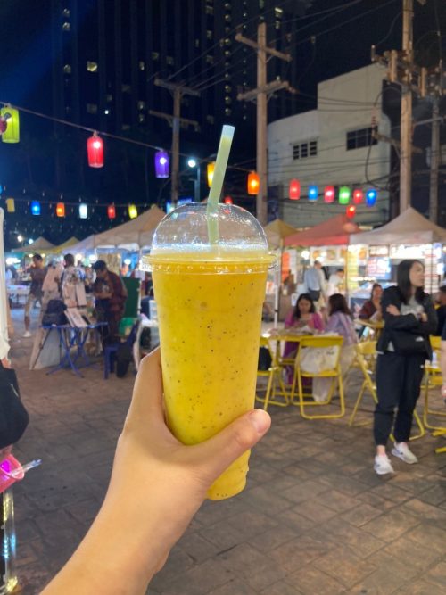 その後は、楽しみにしていた「ナイトバザール」へ。美味しい食べ物や可愛い雑貨が溢れ、ストリートではダンスや絵描きなど、活気あるローカルな雰囲気を満喫できます。この日は、タイらしいデザインのワンピースや、オーダーできるパスポートケース、お土産を購入。パスポートケースは、約130円でカラーとスタッズ、名前などの文字を入れてオリジナルデザインに仕上げてくれました!また、約140円で購入できる特大サイズのスムージーがフレッシュで美味しかったです♪