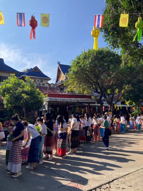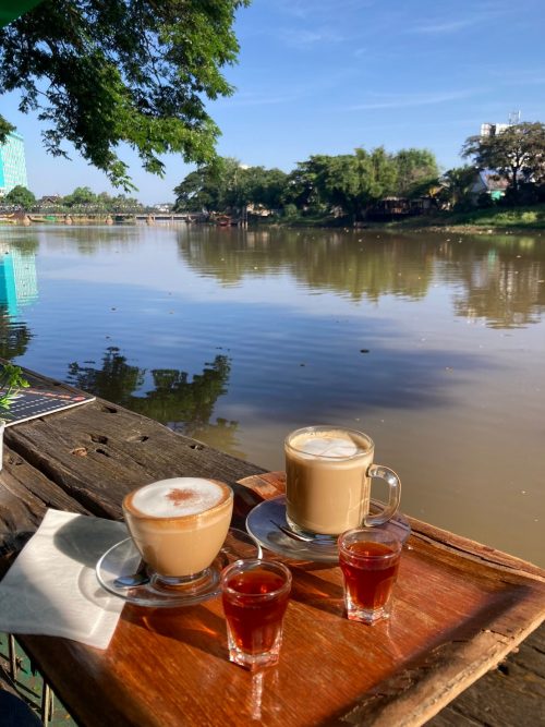 最終日は、夕方の帰りの便まで自由行動だったので、「チェンマイ旧市街」まで、約30分ほど歩いて足を運ぶことに。途中、Googleマップで見つけた川沿いのローカルなカフェに行ってみました。この辺りは、日本人がまったくいないエリアで、観光地とはまた違う穏やかな雰囲気。コムローイ祭りの2日目ということもあり、運良く地元の方々が近くの川で灯籠流しをしている光景を目にすることができました。 その後、午後4時頃にホテルのロビーに集合、翌日朝無事に日本へと帰国しました。旅行中に購入したタイパンツは、リラックスできてフライトに大活躍でした!
