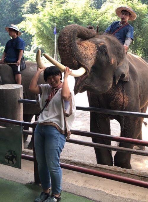 その後、ショーの会場に移動し、100円ほどでバナナの入ったカゴを購入。餌をあげたり、象と触れ合うことができました。人に慣れていているのか、私たちの首に鼻を巻きつけたり、ほっぺたにチューしてくれたりとサービス満点。ショーでは、象たちがサッカーや絵を描くなど、大盛り上がり。象さんと濃密に触れ合うことのできた貴重な体験でした。