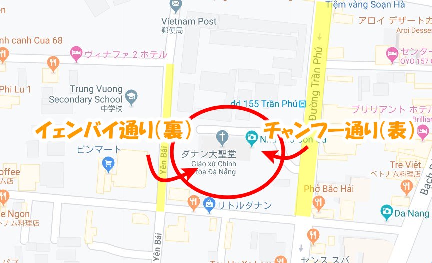 チャンフー(Tran Phu)通りに面する正面の門は、ミサの時間にならない正面の門は開きません。ミサ以外の時間にダナン大聖堂の敷地内に入りたい場合は、教会の裏の通り、イェンバイ(Yen Bai)通りの裏口から入ることができます。