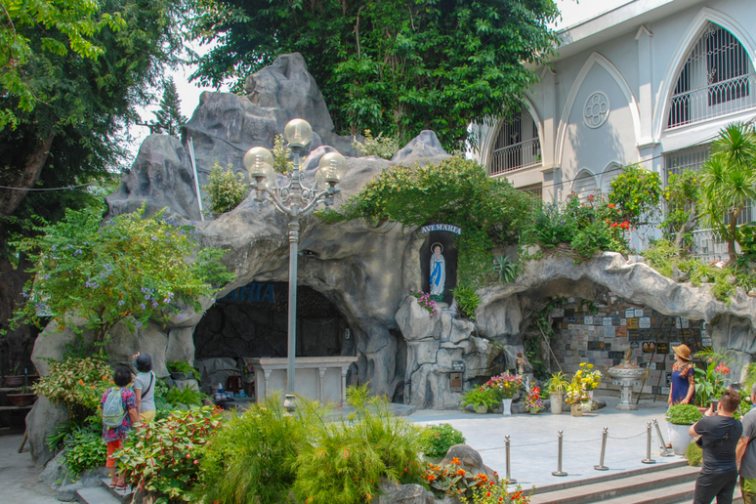 教会の裏手にまわってみると、洞窟のような場所が突如として現れます。中央のくぼみに、マリア様の像がちょうどピッタリおさまるように祀られており、毎日訪れる数千人以上もの礼拝者を見守っています。教会正面側の敷地の木陰には、イエス像が鎮座しています。