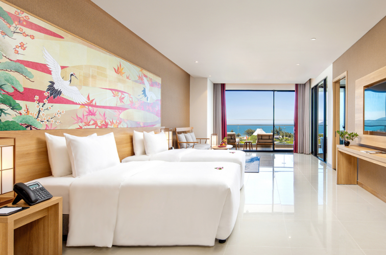 70㎡のデラックスルーム、90㎡のプレミアムデラックスルームのお部屋タイプは合わせて計163部屋。和テイストの装飾や家具には日本人ならどこかほっとする雰囲気。この部屋が一番小さい部屋!?と驚くくらい広々とした客室。また、プライベートバルコニーには露天風呂まで!!残念ながら温泉ではないのですが、ダナンの海を眺めながらゆったりとおくつろぎいただけます。
