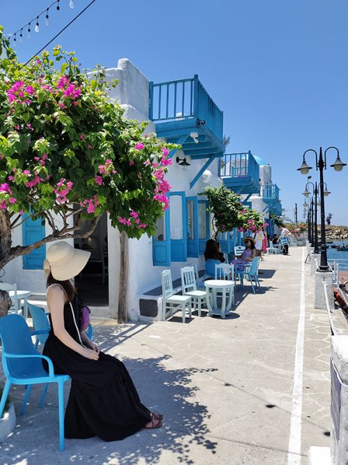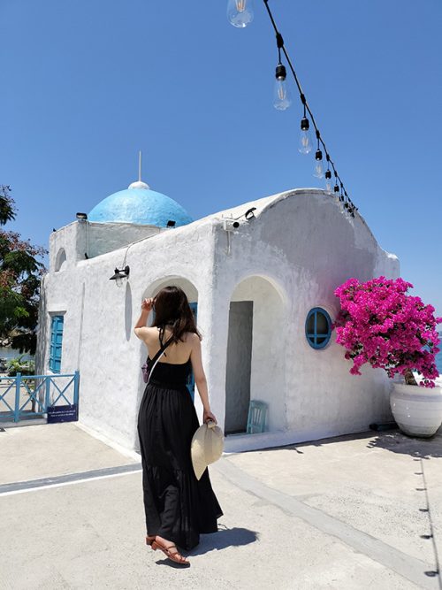 朝食後はチェックアウトを済ませて荷物を預けてから、行きたかったカフェへGrabで移動しました。青と白のギリシャ風カフェ「Son Tra Marina(ソンチャーマリーナ)」です。とっても可愛い場所で、すごく混んでいました。みんな写真を撮って楽しんでいるかんじです。ストロベリーシェイクとブルーベリーティーを注文しましたが、ブルーベリーティーが美味しかったです。私たちも写真をたくさん撮って楽しみました!