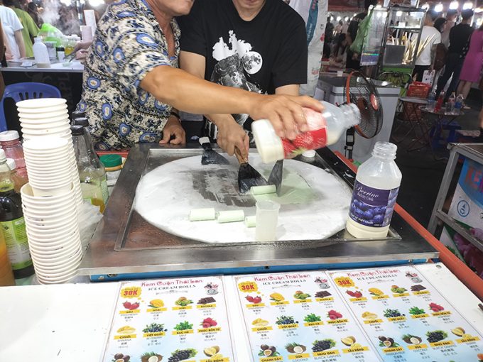 夜になったので「ロン橋(ドラゴンブリッジ)」のナイトマーケットへ。結構距離はありましたが、写真とか撮りながら行きは歩いて行くことに。ナイトマーケットはハン市場と異なり、はじめから金額が書いてあるものが多く、もともと安いしディスカウントもあったりと、怖い思いをせずお買い物を楽しめました! 日本でも一時期流行った鉄板の上で作るロールアイスを食べてみました。屋台の水などはお腹をこわすと注意していましたが、アイスなら大丈夫と食べてみたのです。パッションフルーツ味を注文したのですがとても美味しかったです! その後お腹も全然平気でした。