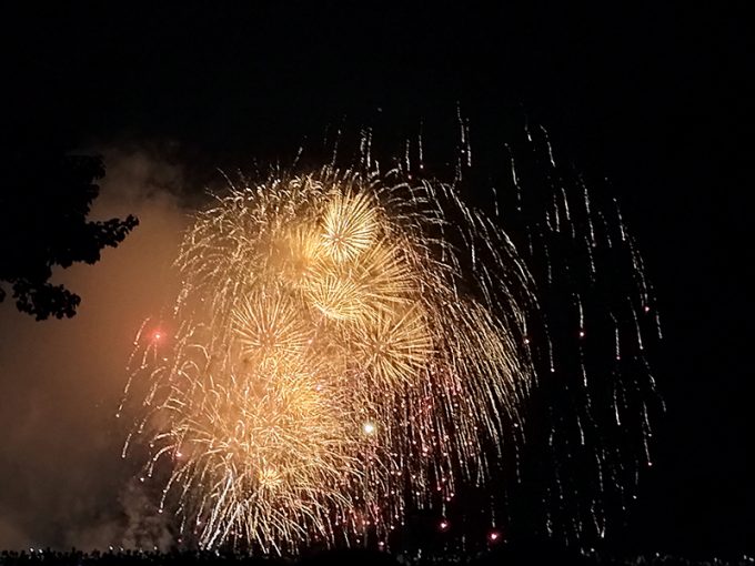 花火の時間になり、カフェから川沿いに移動しました。はっきりとした場所は知らなかったのですが、川の上に花火があがると思っていたのです。そしたらロン橋(ドラゴンブリッジ)の近くのビルなどがある街のほうにあがりました。橋の上から見るのがよかったかもです。いちおう見ることはできました。