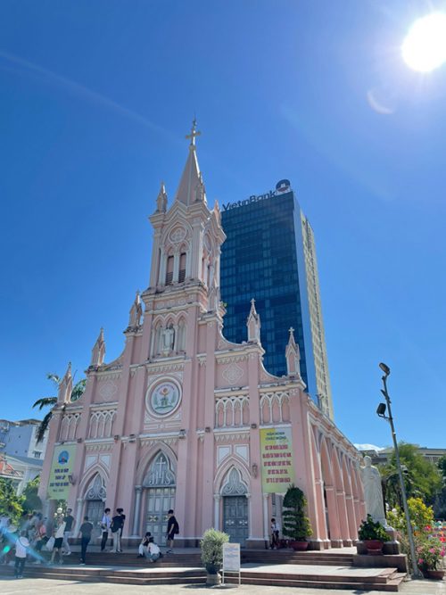 ホテルはチェックアウト済みでしたので、フロントに預けてある荷物に追加してお買い物をしてきたお土産も預けてから、また観光に出かけました。ホテルのすぐ裏にある「ダナン大聖堂」へ向かいました。ピンクの可愛らしい教会です、写真を撮って楽しみました。