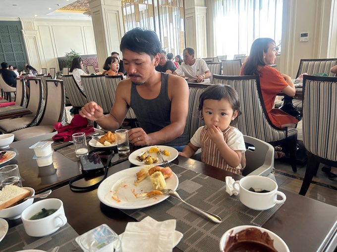9月3日、ホテルの朝食ビュッフェをいただきました。ベトナム料理からパンや卵などの一般的な料理までたくさん種類があり、2歳の息子が食べられるものもあったのでとてもよかったです。ホテル自体、サイトで見てとてもよいと思って選んだのですが、お部屋も想像以上によくて大満足でした! ただ、キッチンがあるのにレンジはなく、お皿やフォークなどもないので自分たちで用意が必要。でもその点を含んでも、総合的にはすごくよかったです!