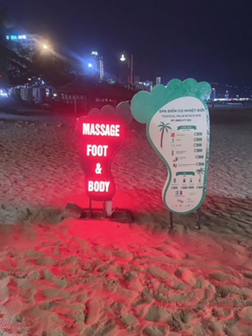 食後も街歩きを楽しみました。ダナンの中心部は夜も賑やかです。カフェでテイクアウトしてビーチを歩いていたら、光った看板があったので行ってみたらマッサージ屋さんでしたので、マッサージをしてもらってからホテルに戻りました。
