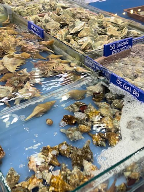 朝食後、まずは飲み物などの買い出しにタクシーで市内の「Kマーケット」に行きました。ビールやお菓子を購入。タクシーのドライバーさんが買い物中も待っていてくれるというので、1日この方にお願いすることに。買い物した荷物もタクシーの中に置いたままにできて便利なので。ただその後、観光で「ミーケビーチ」に行きたいと伝えたのですが、「ダナンビーチ」に連れて行かれました(笑)。あまりきれいな海ではなかったですがビーチで軽く遊び、その後は「ハン市場」に移動しました。広い市場ではお土産購入を楽しみました。