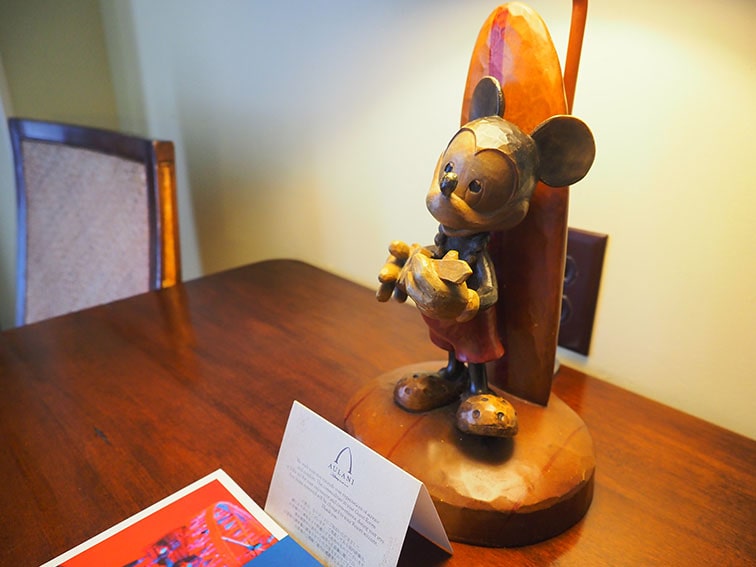 客室設備の充実度や快適性はもちろんのこと、アウラニ・ディズニー・リゾート&スパ コオリナ ハワイの最大の魅力は、ハワイとディズニーが融合したその特別な空間です。チェックインして客室に入ると目に入るのはお花を添えたかわいいミッキータオル!テーブルランプの支柱にはオールドハワイでレトロな雰囲気がかわいいミッキーマウスが佇んでいます。ハワイ×ディズニーのホスピタリティで誰もが幸せになれる場所でした♪