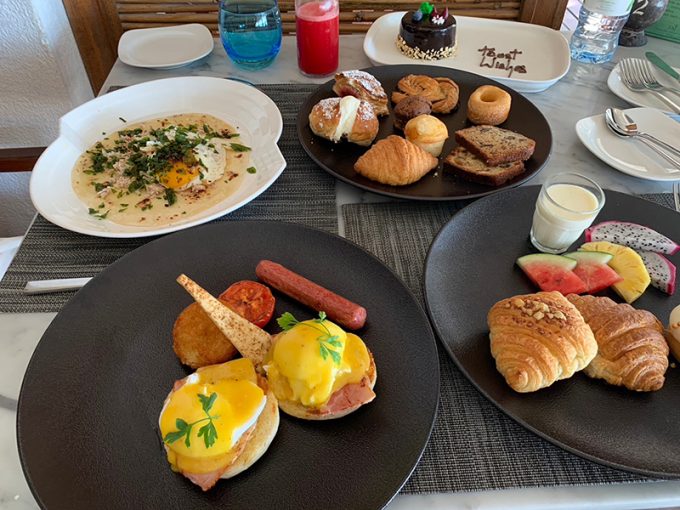 8月5日、朝からすごく天気がよくて、水上ヴィラから見える美しい海に感動しました。海の写真を撮ったり、おそろいのペアルックのTシャツを着て海を眺めてのんびりしました。朝食は、ビュッフェ形式と注文形式が混ざっていて、メインの食事は注文することができました。曜日限定のメニューが毎日出ていて、この日はモルディビアンブレックファーストをいただきました。トルティーヤみたいな生地の上にツナとか野菜がのっていて、塩加減がちょうどよくて口に合いました。エッグベネディクトも作ってもらいました。その他、パンやドーナツ、マフィン類がとても美味しかったです。滞在中、毎日朝食はこのレストランでいただいたのですが、曜日限定のメニューがありますし、常設のメニューもたくさんあって、6泊しても食べきれないほどの充実ぶりでした。あと、瓶に入って置いてある日替わりのフレッシュジュースがとても美味しかったです! ウォーターメロンやバナナのジュースなどとても新鮮で大満足でした。