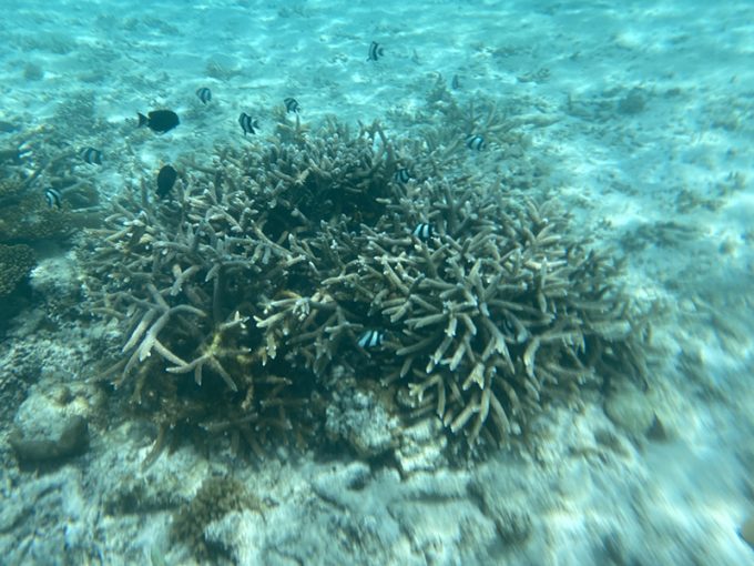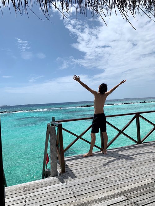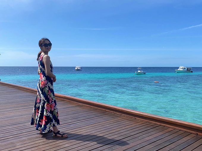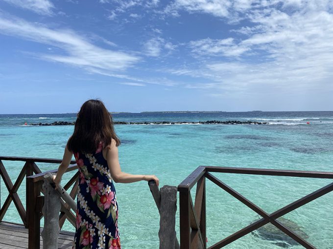 午前中は、きれいなビーチを散歩して写真を撮ったり、あとはフロントから島に入るまでの長い桟橋の上でも写真を撮ったりして過ごしました。ヴィラに戻ってからは、水着に着替えてシュノーケリング! 水上ヴィラにある階段から直接海に入れました。至る所に珊瑚があって、見たことのない魚も泳いでいて、とてもきれいな海の中でした。滞在中はずっとシュノーケリングのセットが貸し出されているので、いつでも気が向いた時に海に入れました。