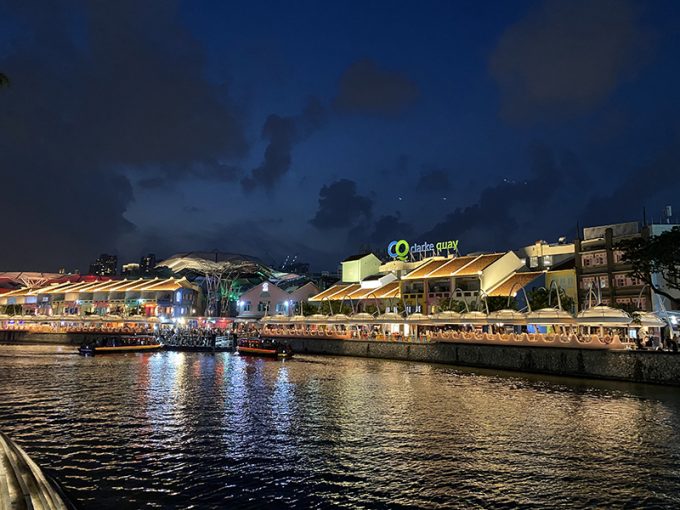 昼食はフードコートで食べて、その後は「ラッフルズ ホテル」を見学に行きました。いったんマリーナベイ・サンズに行って預けていた荷物を受け取ってから、最後に「クラーク・キー」に行き、夜景を眺めたり写真を撮ったりしました。