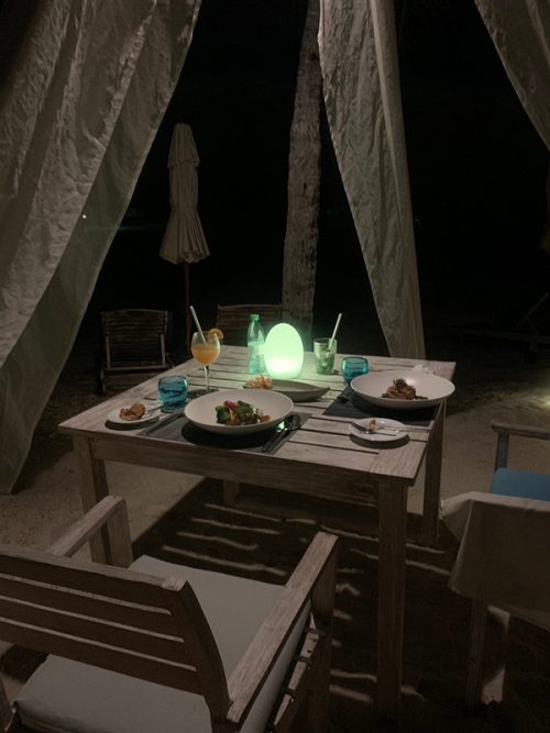 この日の夕食は、ハネムーン特典のビーチでのディナーでした。砂浜に設置されたロマンティックなテーブルと椅子で、2人っきりで夕食をいただきました。ライトアップなどもされていて雰囲気がよかったです。食事内容は、2日間連続で利用した夕食のレストランとはまた別の、もうひとつのレストランの方のメニューでした。こちらのほうがお寿司などもあり、さらにメニューが充実していました。ちなみにメニューは英語なので読めないものもあったのですが、写真を撮ったら全部日本語に変換される、Google翻訳のアプリを使って注文していました。