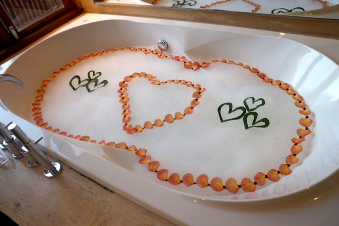 夕方頃に部屋に戻ると、ハネムーン特典のバスデコレーションがほどこされていました。バスタブが泡でモコモコで、花びらも浮かんでいて、とてもうれしかったです。私たちのヴィラのハウスキーパーさんはすごくよい方で、かたことの英語でやりとりさせてもらいましたが、「気になることあれば何でも言って」とか、「写真撮りましょうか?」とか声をかけてくれてとても親切でした!