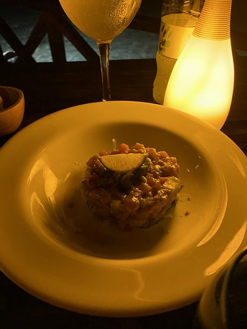 夕食は、前日と同じレストランへ。この日はウェイターが教えてくれてデッキから海をの覗いてみると、小さい可愛らしいサメが見えました。星空もきれいだし、素敵な空間でした。ちなみに夕食のメニューに“冷たいまぐろのセビーチェ”というものがあったのですが、上にライムがのっててさっぱりしていて、とても美味しかったです。滞在中食べたものの中で一番美味しく、何度が食べました。