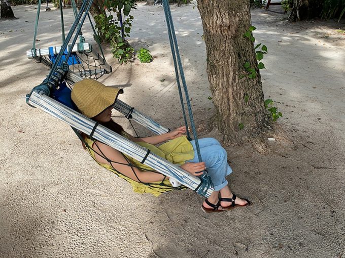 昼食後は、妻が妊娠をしていたので、休憩がてらお部屋でのんびり過ごしました。あとはハンモックが島内の至る所に吊るしてあったので、そこで写真を撮ったり、ゆっくり話をしたり、まったりと過ごしました。