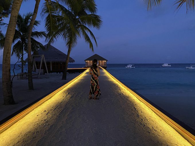 シンガポールを20時半頃に出発し、モルディブの首都マーレには22時頃に到着しました。到着後、入国審査にすごく時間がかかってしまって、出迎えのガイドの方との集合時間に20〜30分遅れてしまったのですが、空港の外に出た瞬間、ガイドの方がいっぱつで見つけてくれて安心しました。遅れたのに親切な対応の方で、ありがたかったです。空港からホテルのある島へは、スピードボートでの移動でした。揺れが結構すごくて、40分くらい乗っていましたがかなり酔いました。酔いやすい人は酔い止め必須です。妻は妊娠の初期で薬が飲めないので、日本から持って行った飴をなめてなんとかやりすごしました。
