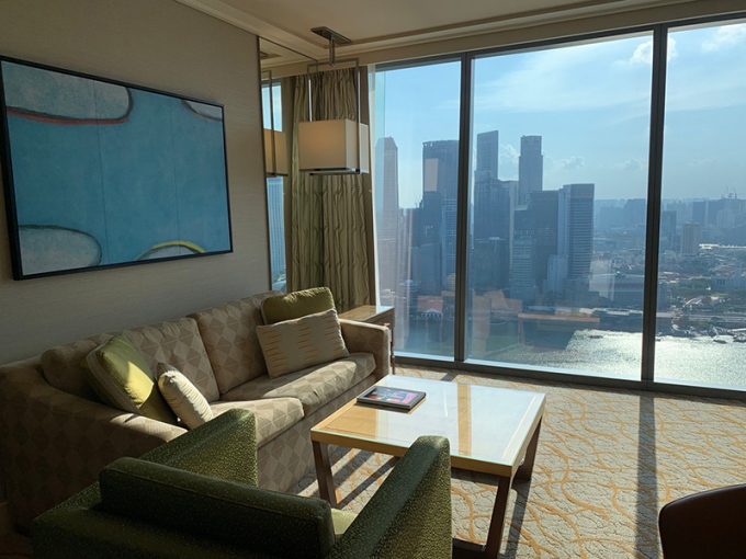 8月11日、のんびり過ごしたモルディブとは全くの別世界で、シンガポールはいろんな観光地がたくさん! まずは「サルタン・モスク」を見学に行き、異国情緒漂う「アラブストリート」を散策しました。その後は、御社で予約したホテル「マリーナベイ・サンズ」に移動しました。着いたのが11時か12時くらいでチェックイン時間より前でしたが、チェックインさせてくれました。ハネムーンと伝えていたので、無料でお部屋をアップグレードをしてくれていて、46階で眺望が素晴らしいお部屋でした! 小さくマーライオンまで見えるベイビューで、広さもあり、とても快適でした!