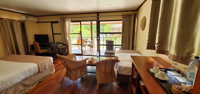 チェックイン時には、すでに荷物も部屋に入れてくれていました。ゆったり広々としたバンガローで、トイレが浴室とは別なのもよかったです。各部屋の入り口は、掃き出し窓になっており、プライベートビーチへは歩いて1分ほど。海水浴のほか、ホテルで無料で借りられるカヌーに乗り、遠くの沖へと冒険しました。シュノーケリング道具を持参していったので、海中でたくさんの熱帯魚を見ることもできました。